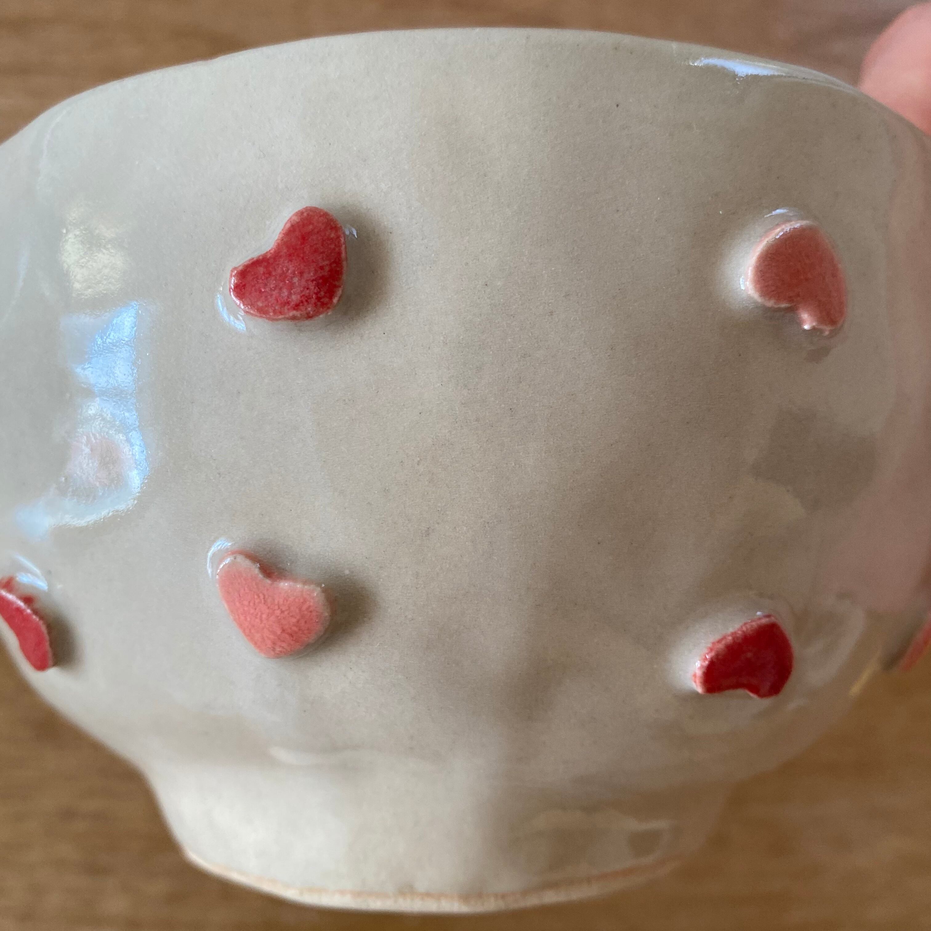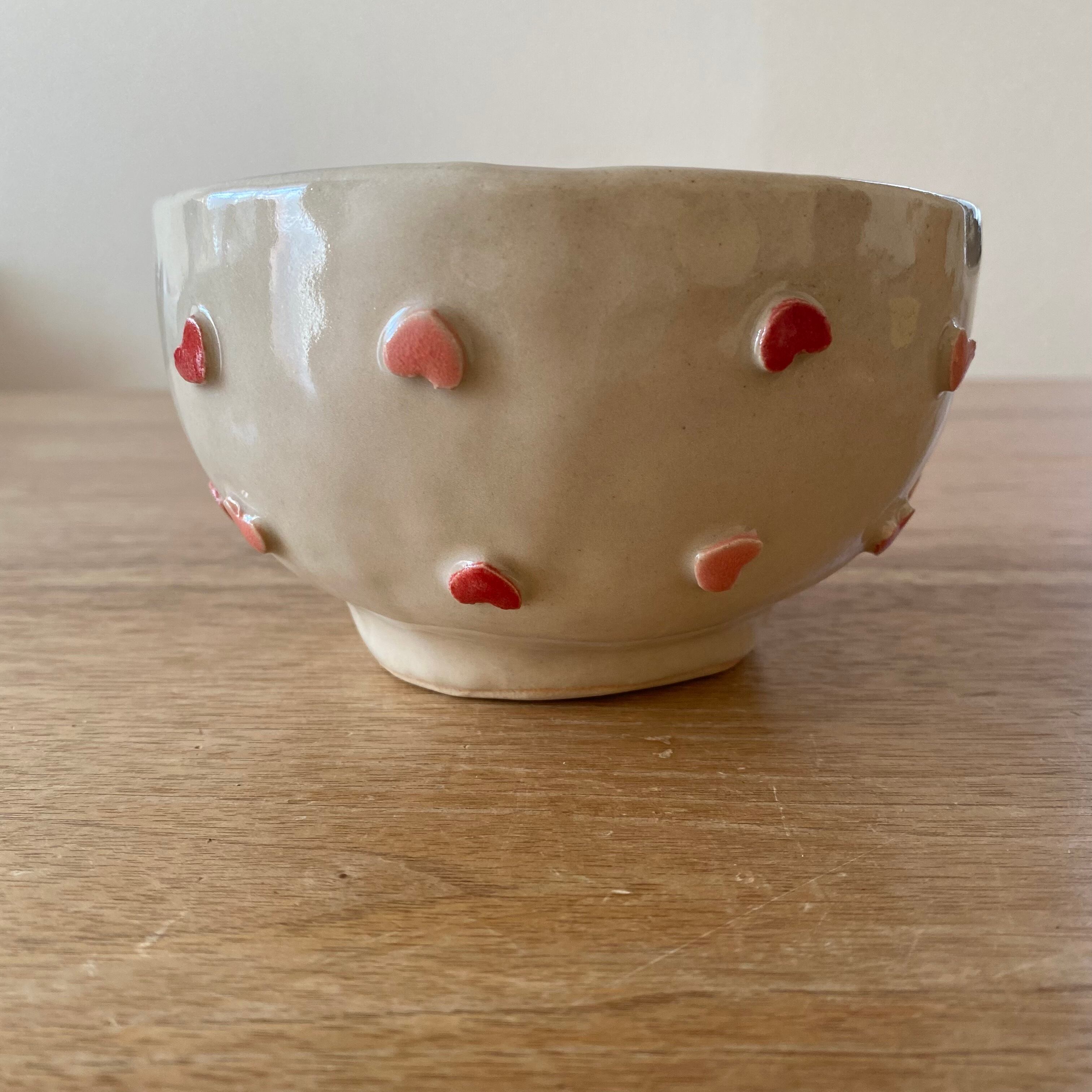 ピンクと赤のハートがたくさん付いた可愛いどんぶりです❣️